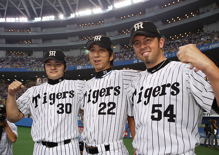 JFK(右から、ジェフ・ウィリアムス、藤川 球児、久保田 智之)ドラフトや新外国人選手など、新加入の選手を含む全選手を紹介します。